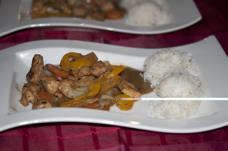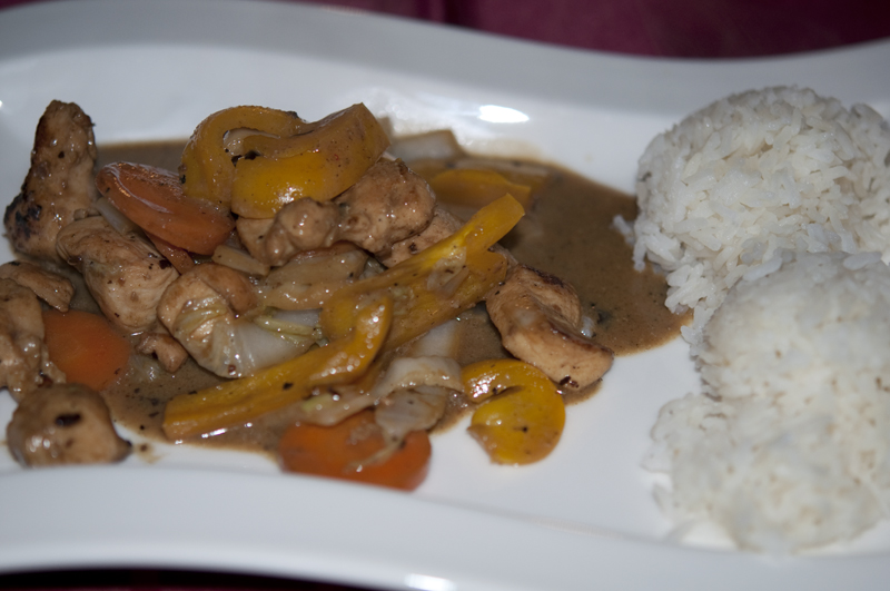 Pak je vyndáme a dáme do zůstalého oleje curry pastu trochu orestujem spolu s černými fazolemi. Přidáme mrkev, papriku a a chvilku později i čínské zelí. Vše má zůstat pěkně křupkave. Nakonec zalejeme kokosovým mlékem necháme sevřít a přidáme předem udělané maso.
