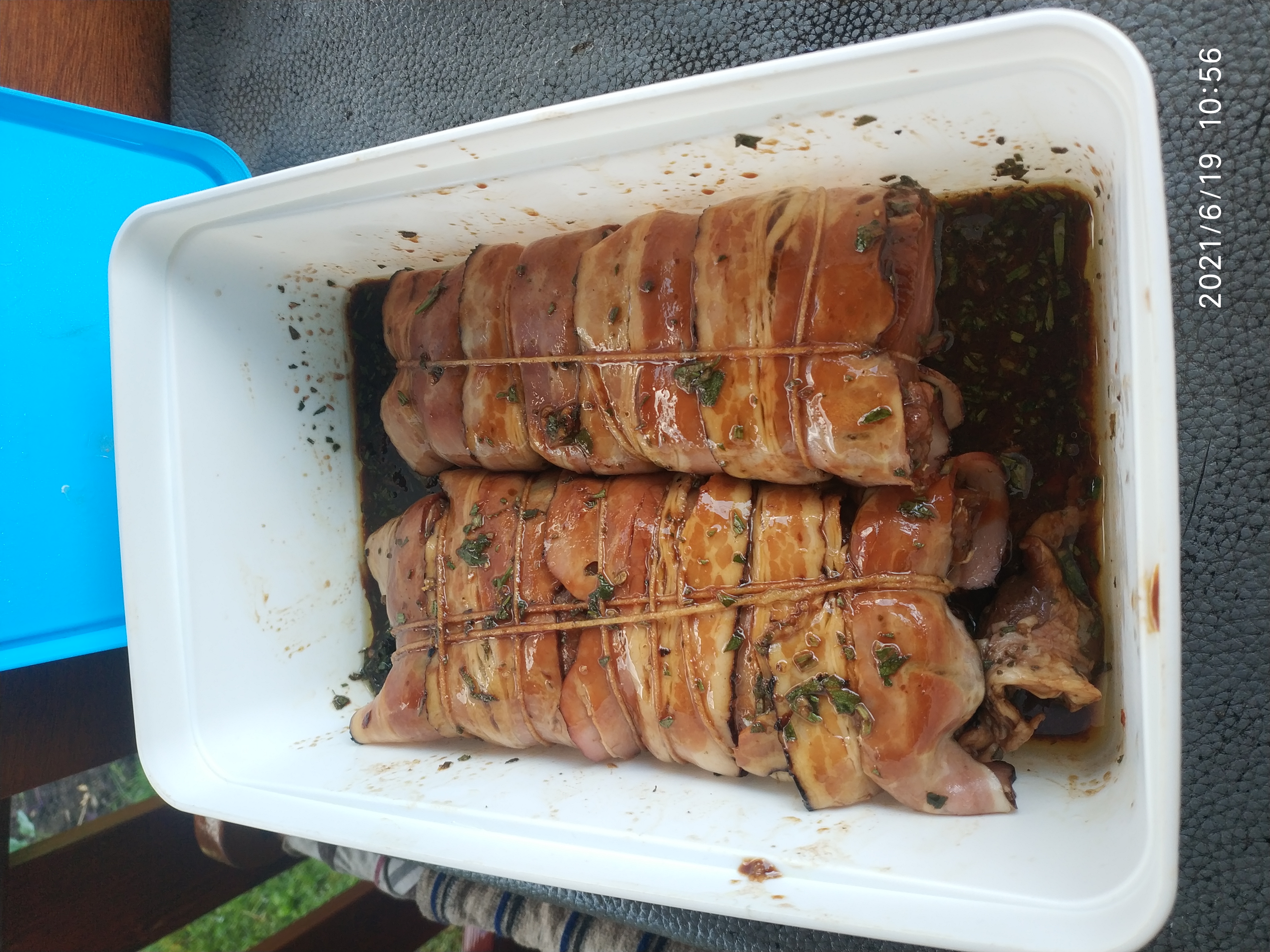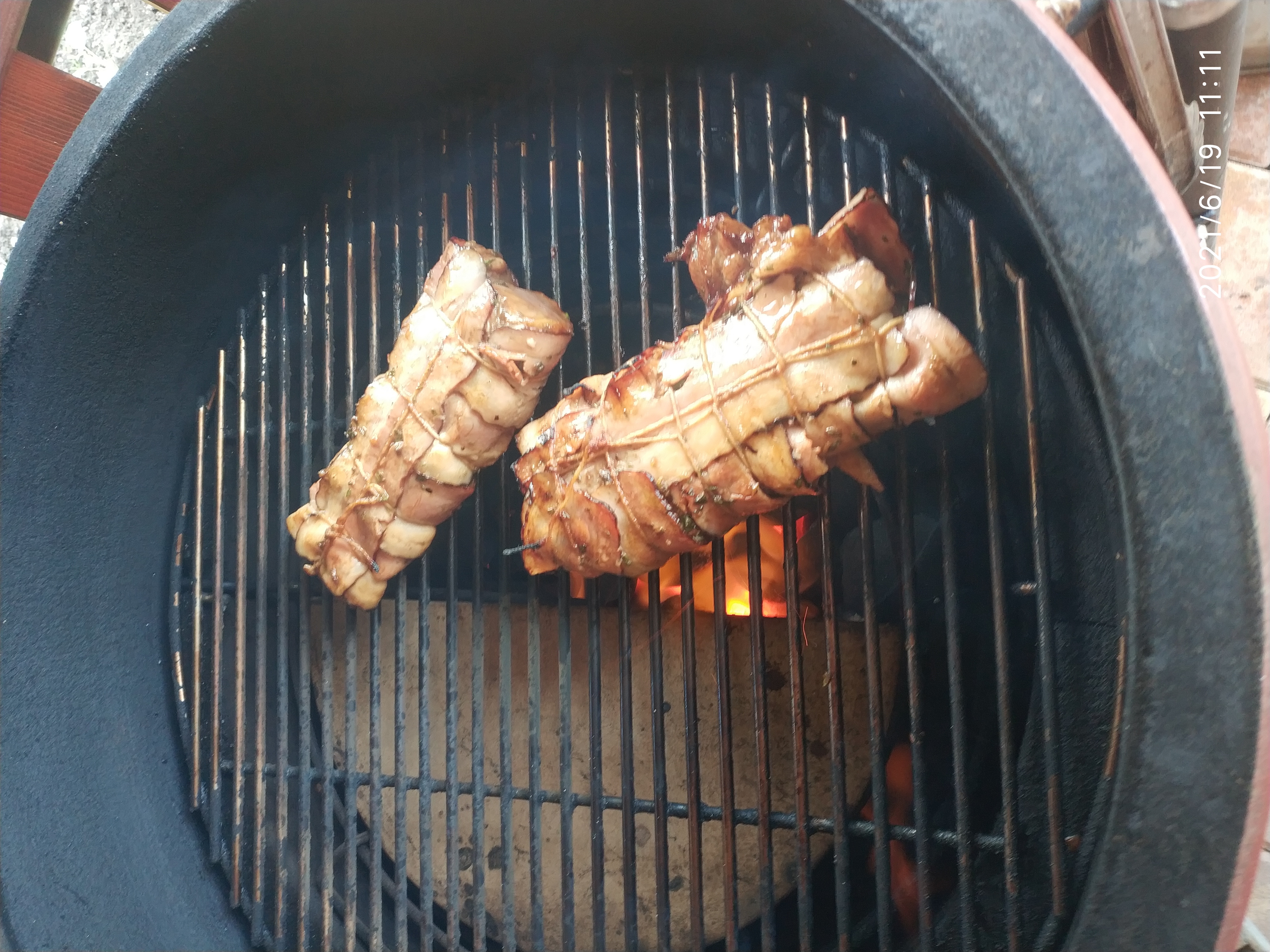s najemno nakrájené šalvěje, rosmarinu, česneku a přidáním octa, cukru, sójové omáčky, soli a pepře. Mášo si na 2 hodinky naložíme. Prudce ogrilujeme. Pak přeložíme na stranu bez uhlí a pod přiklopeným víkem grilu grilujem do