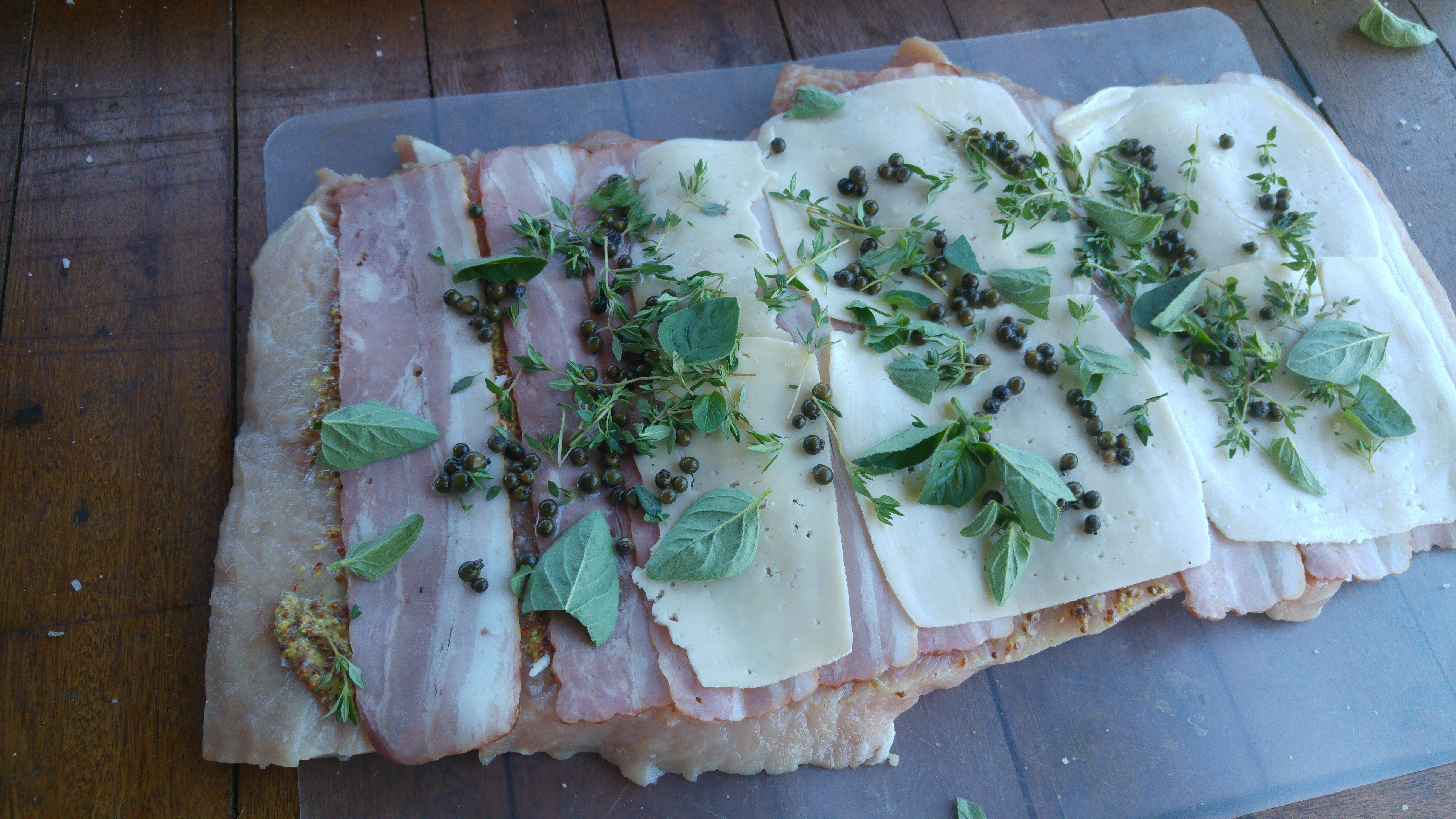 Potřít hrubozrnnou hořcicí, na to vrstvu plátků anglické slaniny, jeden plátek vedle druhého, na to vrstvu plátkového sýra, na to kuličky zeleného pepře náhodně rozmístit, bylinky ze zahrádky, já jsem zvolil tymián a dobromysl, ale asi každý podle vlasních preferencí.