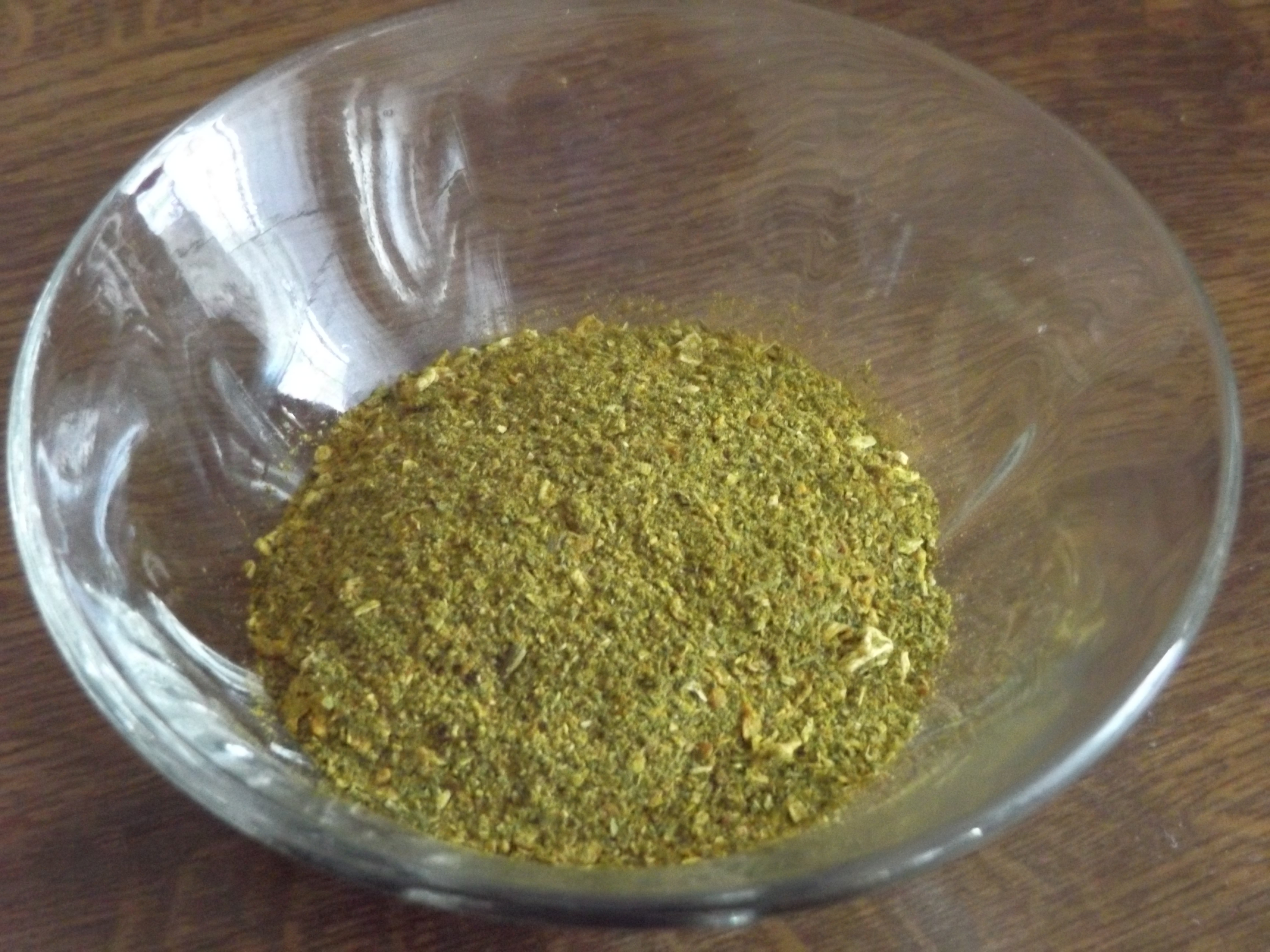 Kořenovou zeleninu nahrubo nastrouháme, cibuli, rajčata, pórek a kapii nakrájíme na plátky, natě pokrájíme na menší kousky a vše usušíme v sušičce, v troubě nastavené na 45-50°C, nebo na slunci. Když jsou všechny suroviny usušené, dáme je postupně do sekacího robota (food procesor) a na nejvyšší otáčky rozsekáme na prášek. Přidáme ostatní koření (kmín, granulovaný česnek...) a dobře promícháme. Směs uchováváme v dobře těsnící sklenici, kde vydrží až do spotřebování, nebo do další sezóny. Má univerzální použití, používám na dochucení polévek, pod maso, jako směs na kořenění grilovaného masa, na ryby a podobně.