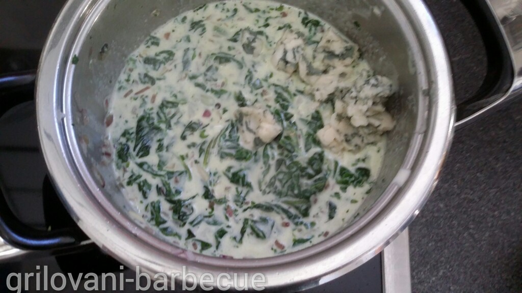 Salotku nakrájíme na jemno, gorgonzola na menší kostky (lépe se rozpouští). Do rendliku dáme trochu oleje, osmahneme lehce salotku přidáme zelený pepř ten jen prohřejeme. Zalijeme smetanou smichanou s hladkou moukou, necháme převařit dochutíme kapkou citronové šťávy, soli eventuálně čerstvě mletým pepřem. Pridal jsem jeste ca. 150g listkoveho spenatu.