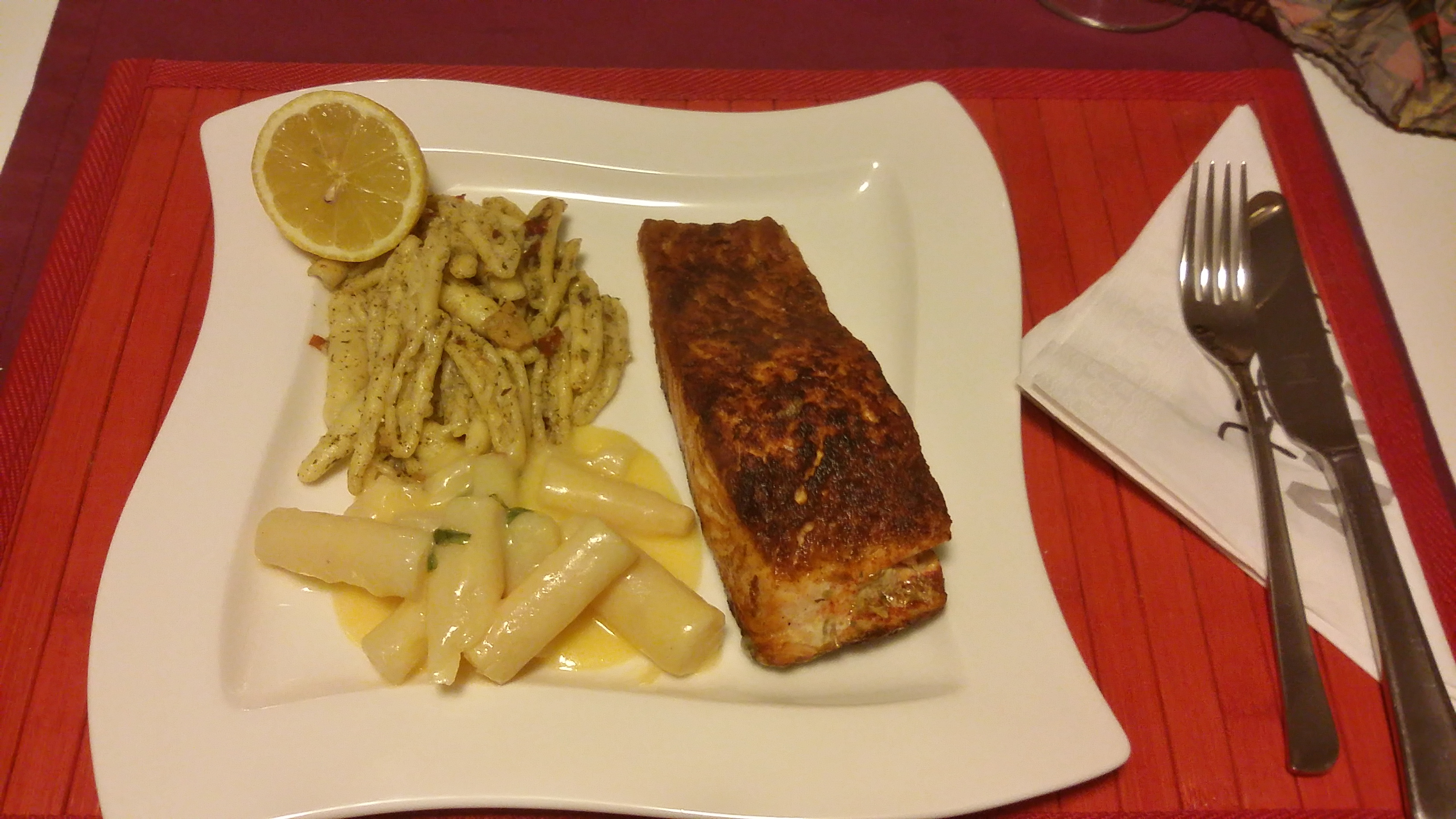 Moc pěkné! Líbí se mi ty přílohy a taky to, že se ryba nekoupe v žádné omáčce. Já jsem dnes měl k obědu Eisbein mit Sauerkraut in Roemer Topf, čili Vepřové koleno pečené na kyselém zelí v římském hrnci. S brambory vařenými ve slupce. Taky dobré!