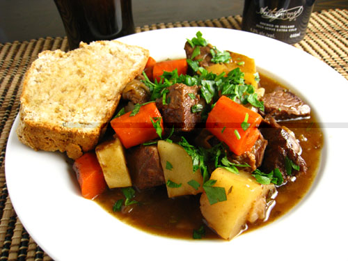 Když Irové začali emigrovat do Ameriky, vyzáblí po hubené bramborové dietě, samozřejmě si přivezli své jídelní tradice. Stew se změnilo a přizpůsobilo místním podmínkám. V Americe není tolik ovcí, proto se do receptů vloudilo hovězí. Podle tradičních receptů je to jídlo husté, hustší než náš guláš. Do receptů se vloudil i Guiness stout, silný černý ležák. Osobně ho nemám moc rád, má málo bublinek a chutná mi jako zvětralé pivo. To je ovšem věc názoru, já osobně, když irské pivo, dávám přednost Harp.