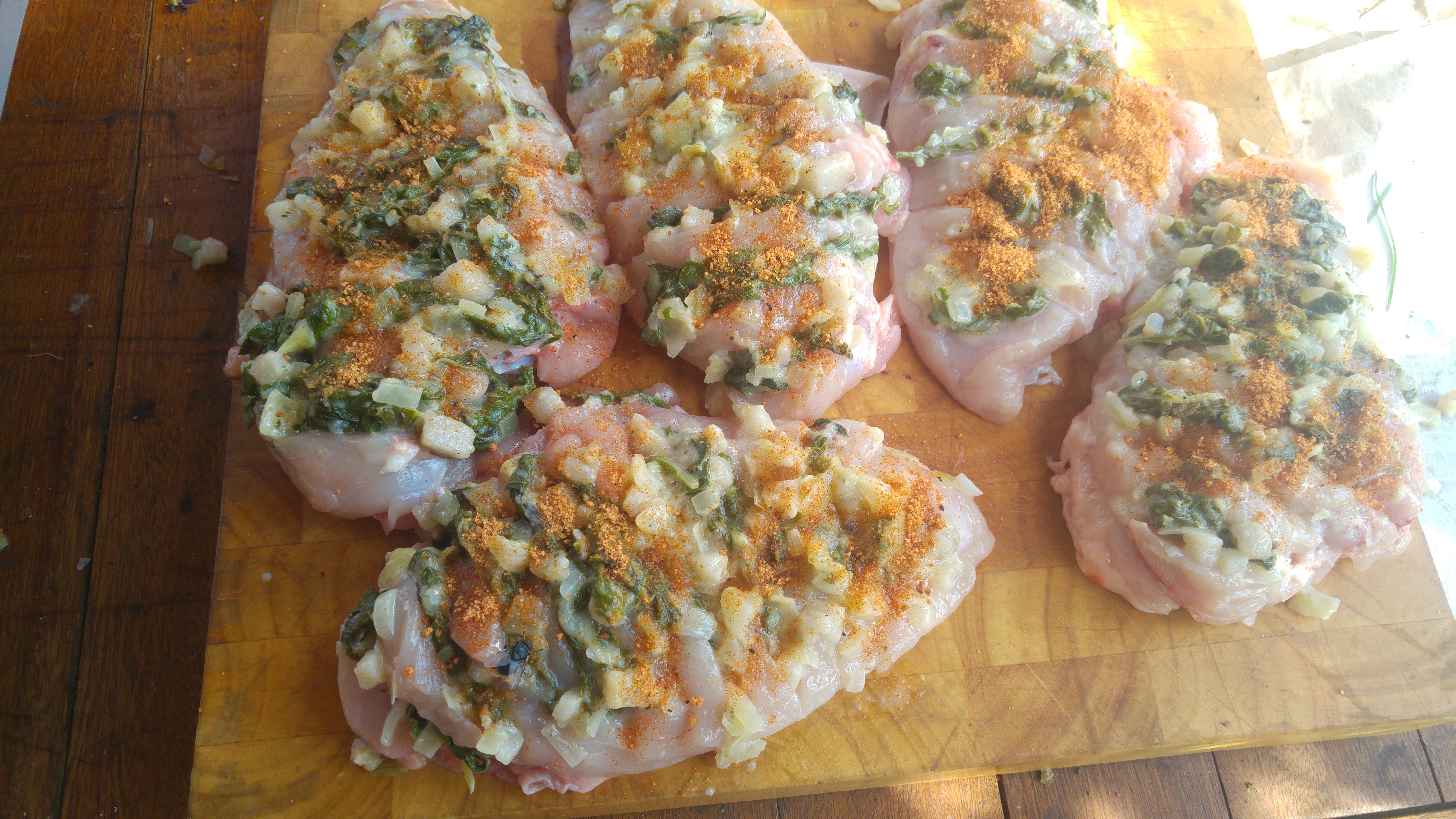 Kuřecí prsa jsem z jedné strany "nakrojil" po cca 1 cm tak aby řez neprošel skrz.