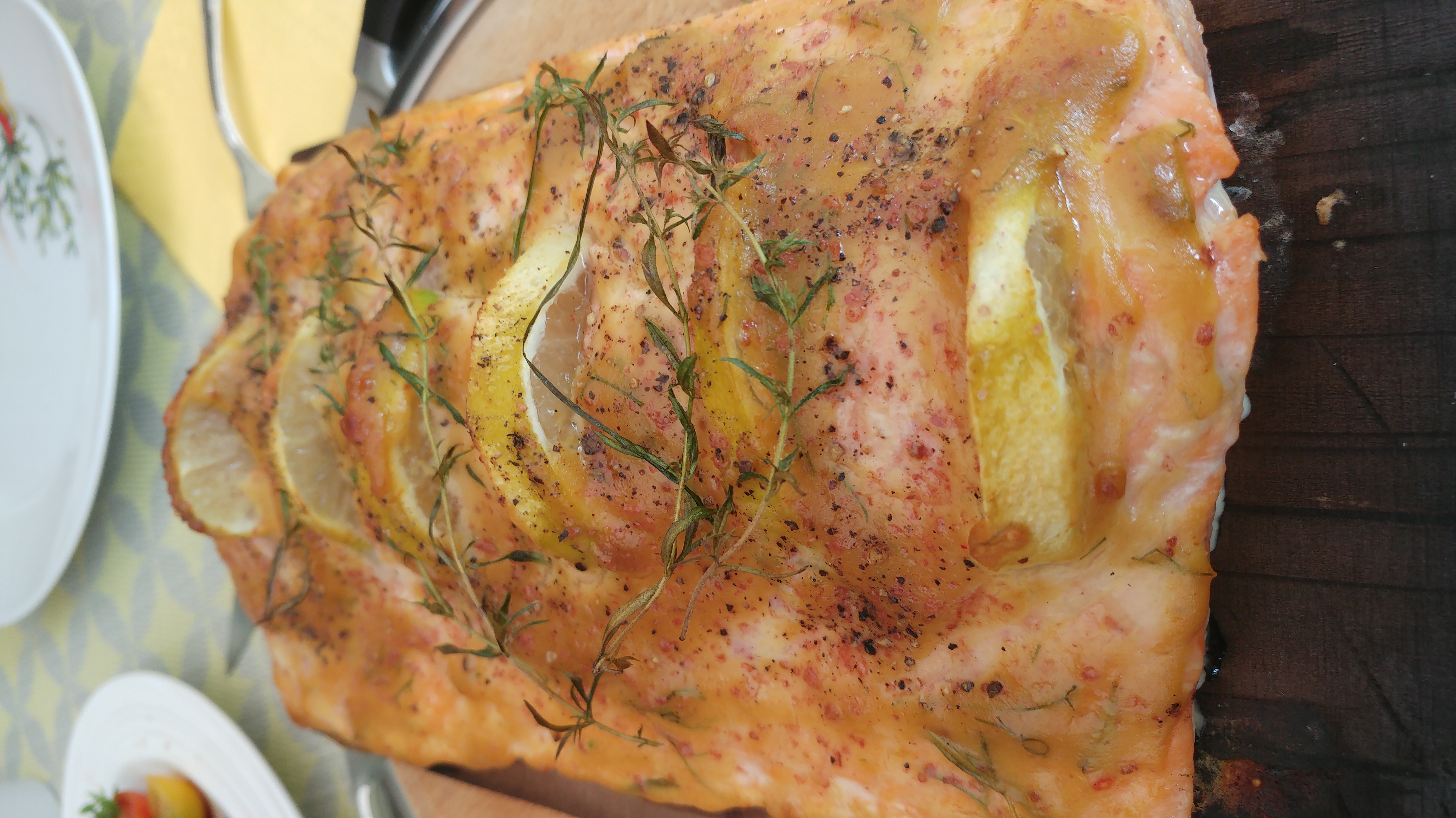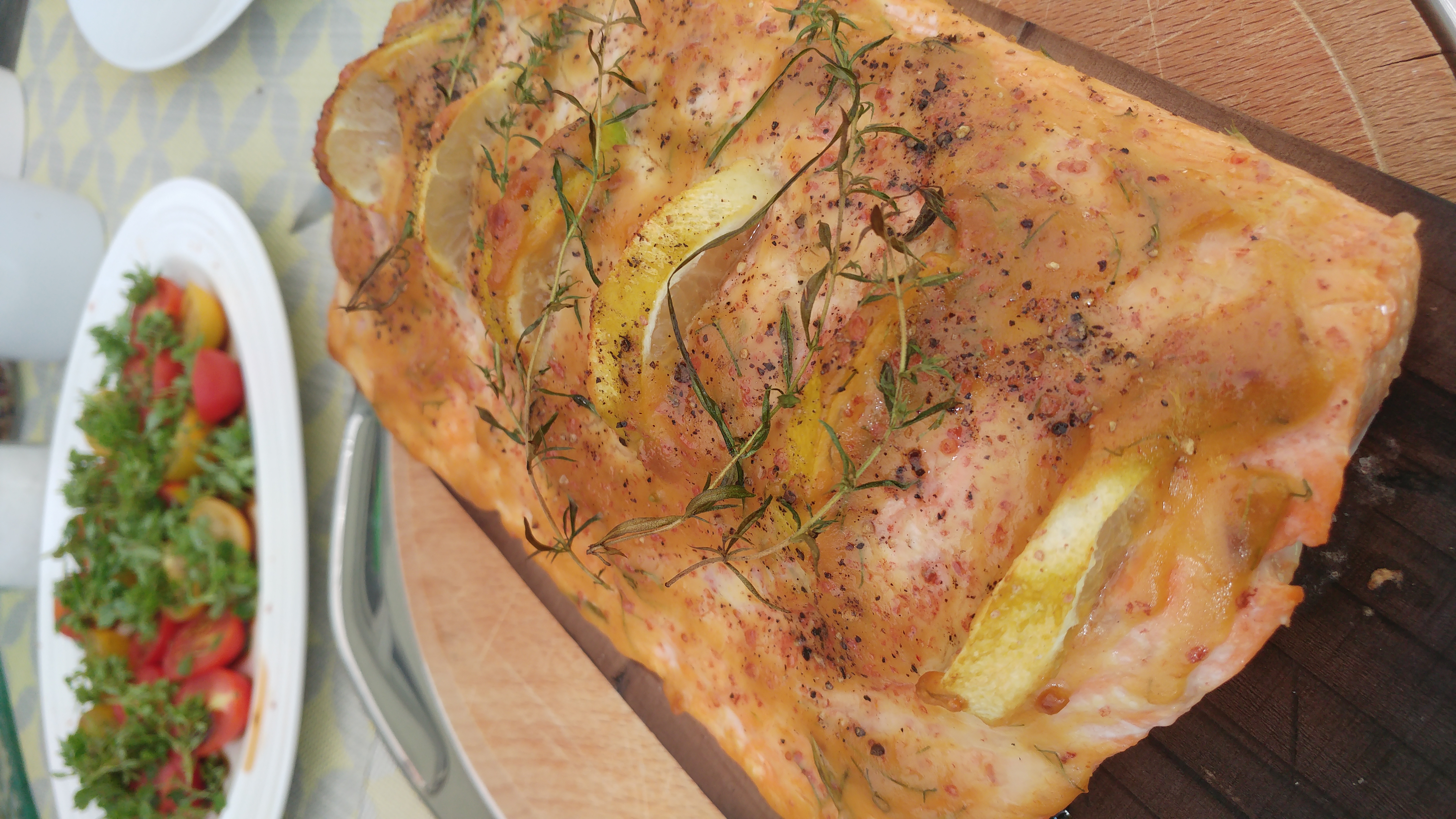 Medová hořčice, limetkova kůra, Creme fraiche, sůl a Kresse. Smíchat dát na rybí File a grilovat na desticce.