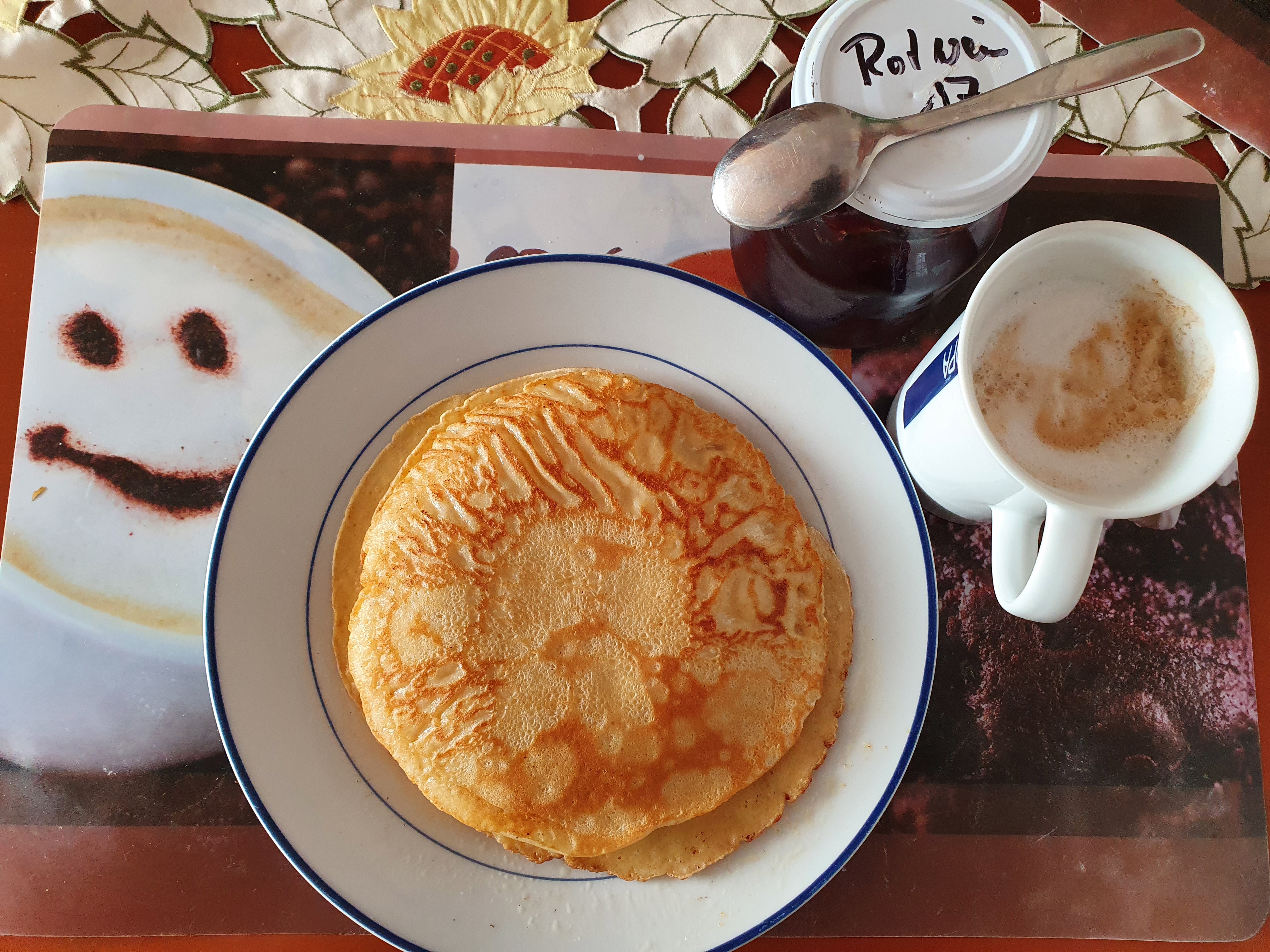 Vse smichame hnetacem nebo rukou s pridanim mleka. Melo by tak vzniknout ridci testo, ktere nalevame na rozehratou panev. Prednosti je nizky obsah cukru.