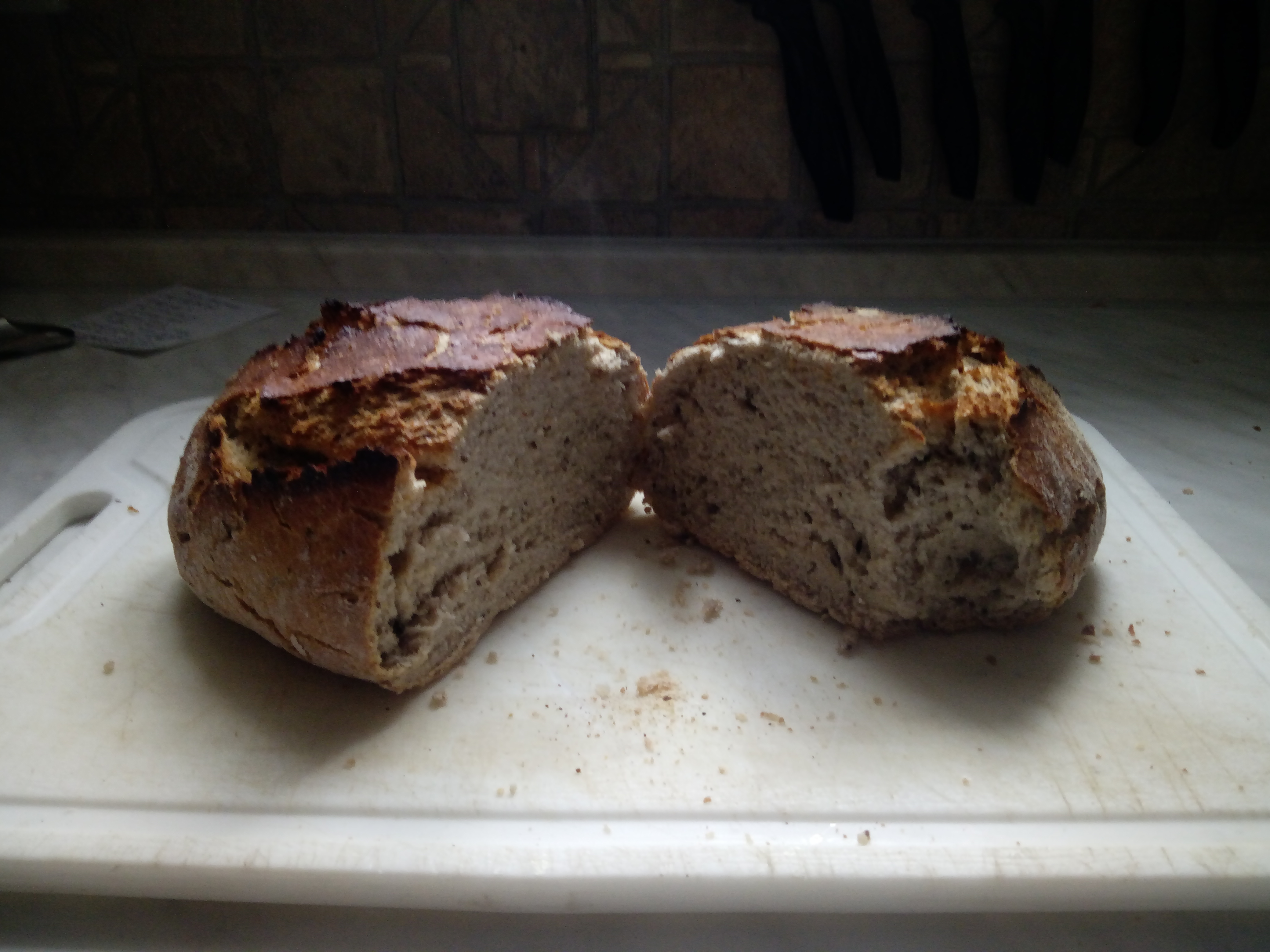 Tenhle chleba jsem zkusil upéct, ale bohužel jsem měl nějaké chcíplé droždí a taky mouka byla kupovaná chlebová celozrnná směs, takže se mi upeklo něco, z čeho by se po provrtání diamantovým vrtákem a naražení topůrka mohl stát krásný a výkonný sekeromlat... :AB